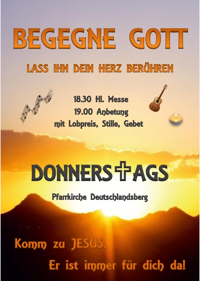 Du kannst Ihm auf verschiedensten Weisen begegnen: durch Menschen, in der Natur, durch die Musik, im Gebet, in Seinem Wort ( = die Bibel), in den Sakramenten, vor allem in der Eucharistie... Hier die Einladung zur Hl. Messe und kurzer Anbetung: